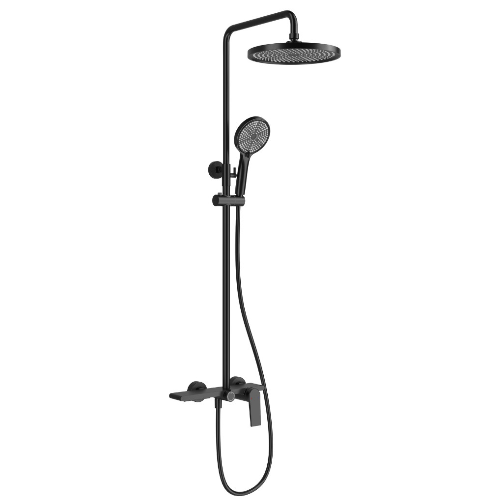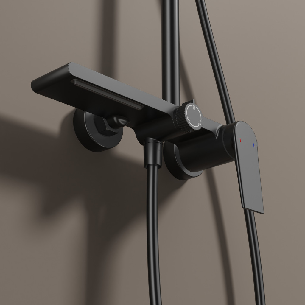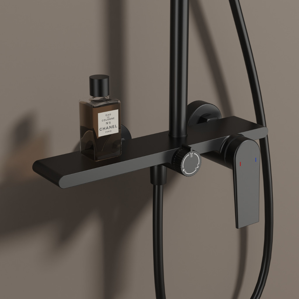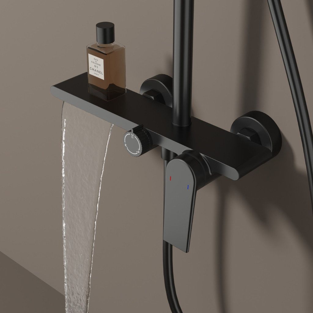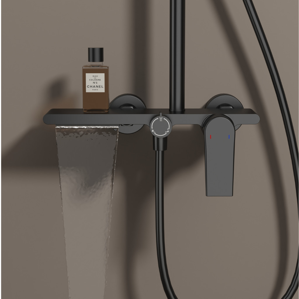 Welland 9003 falra szerelhető zuhanyrendszer falon kívüli felszállócsővel, fekete színben. Kimagasló gyártási minőségben előállított prémium zuhanyrendszer 3 különböző funkcióval, és a központi fej egység felső részén kialakított polccal. A váltókapcsoló segítségével minden funkció egyszerűen kapcsolható.