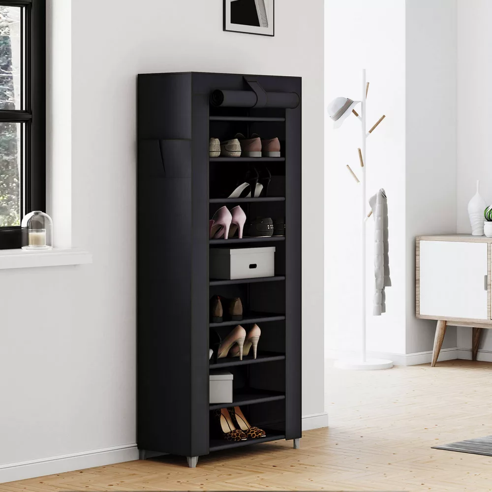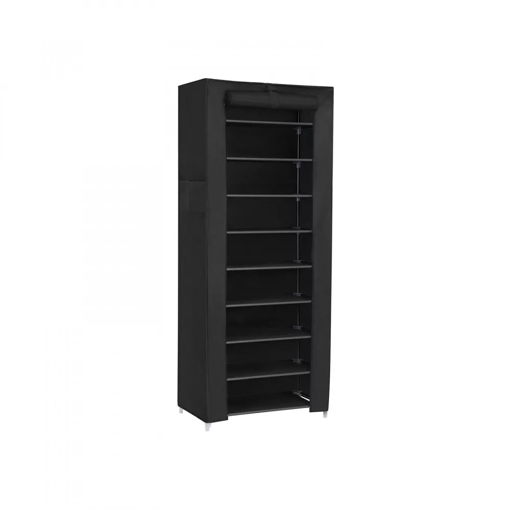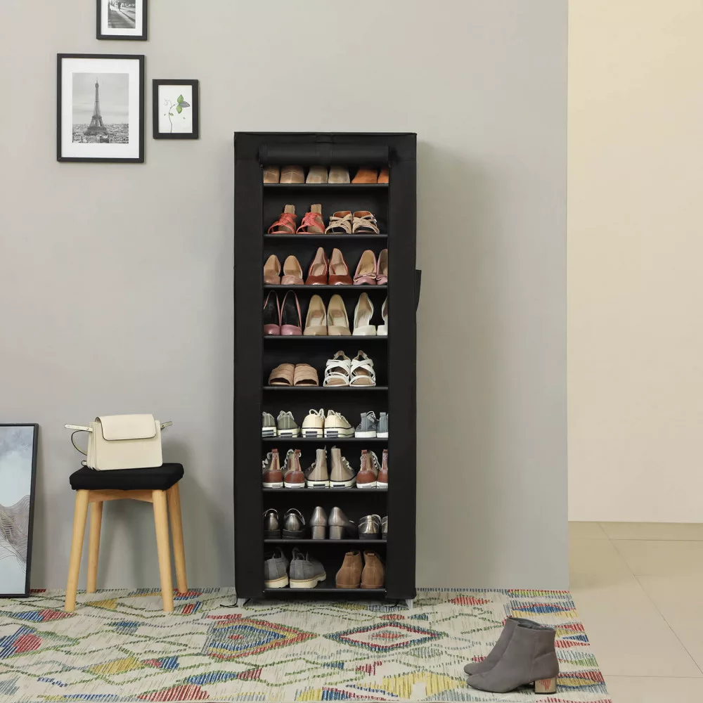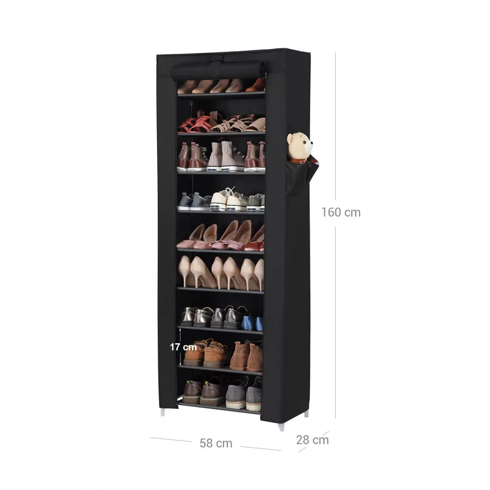 Univerzális cipőtartó állvány vászonszövet huzattal, ami a tépőzáras megoldásnak köszönhetően egyszerűen nyitható és zárható. 9 szintes cipőtároló, a szintek tetszés szerint kivehetőek ha magasabb helyre van szükség csizmák számára.