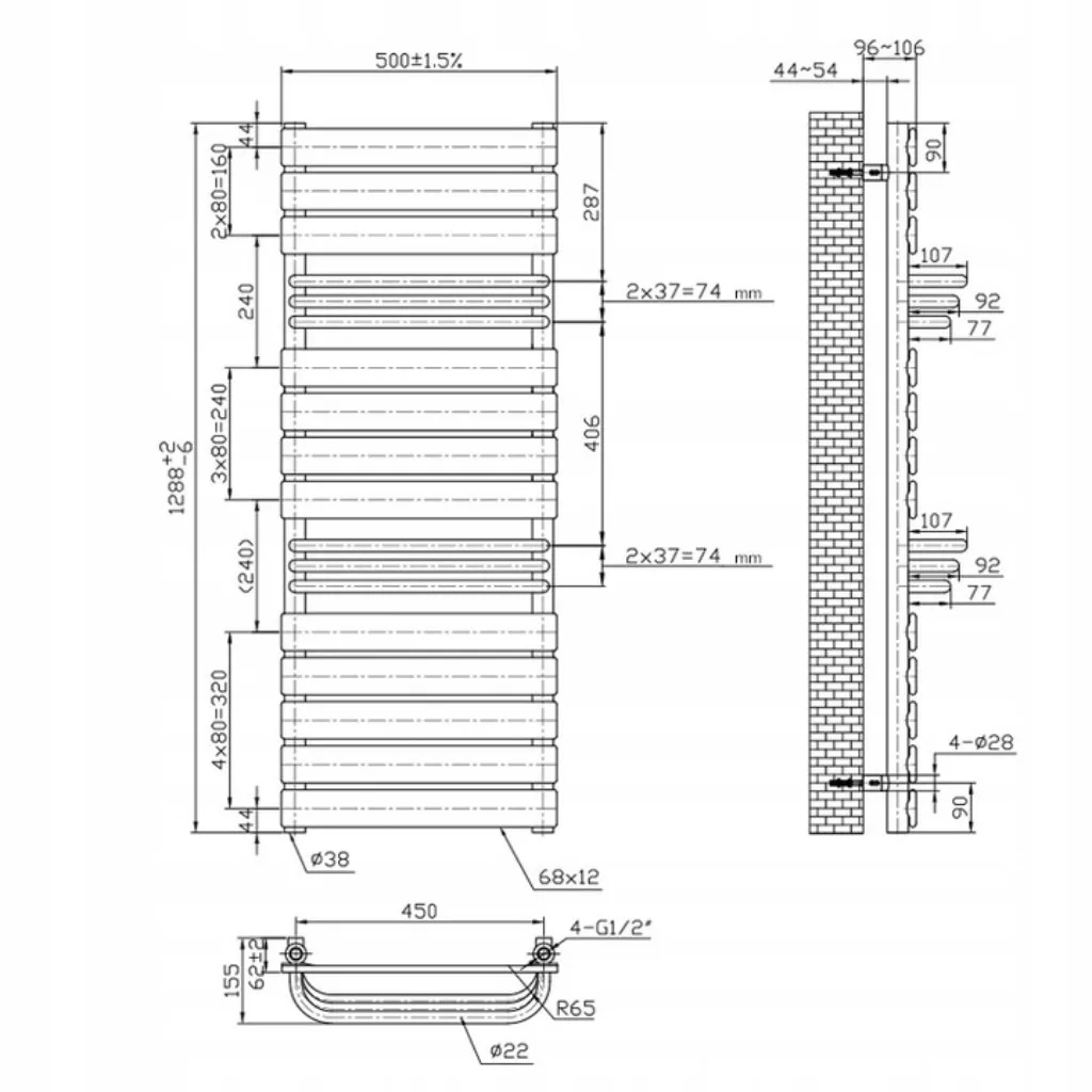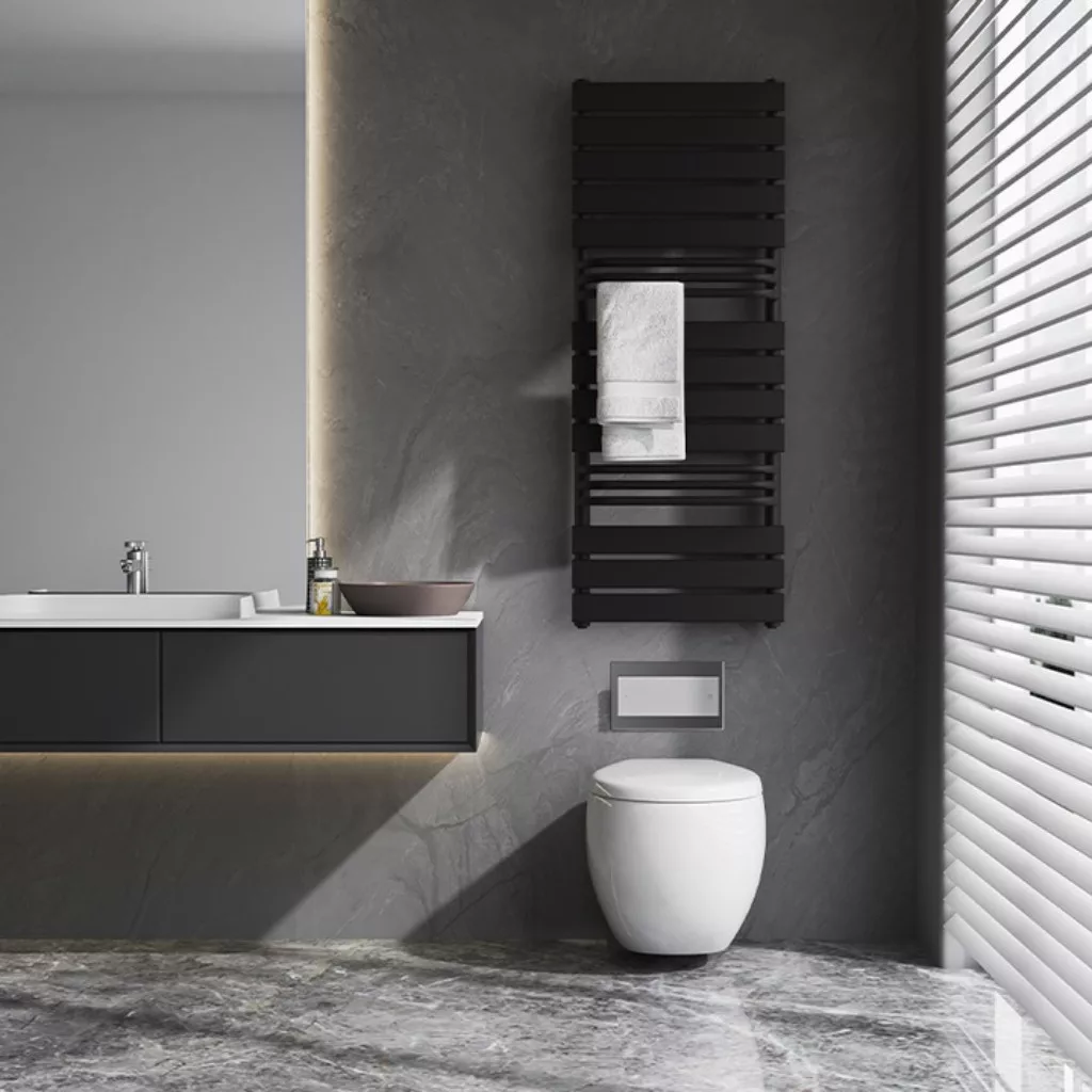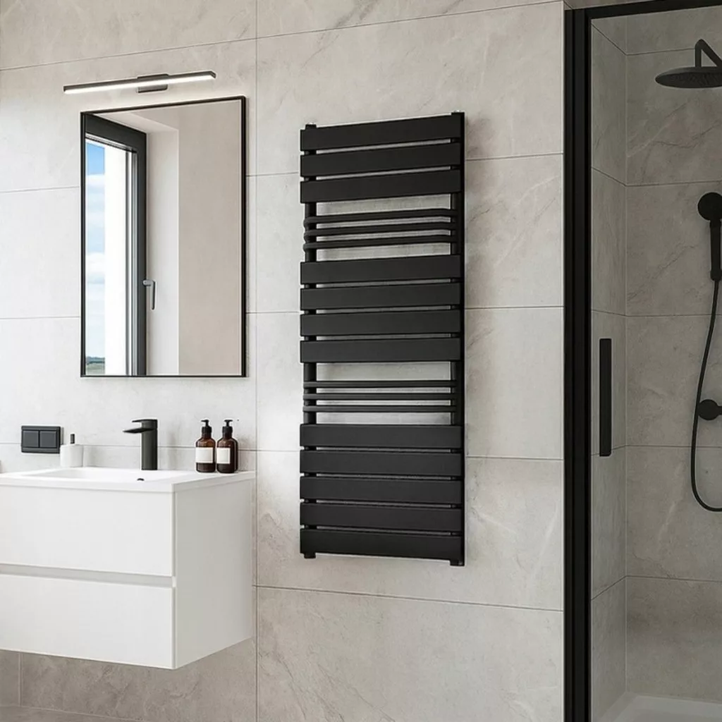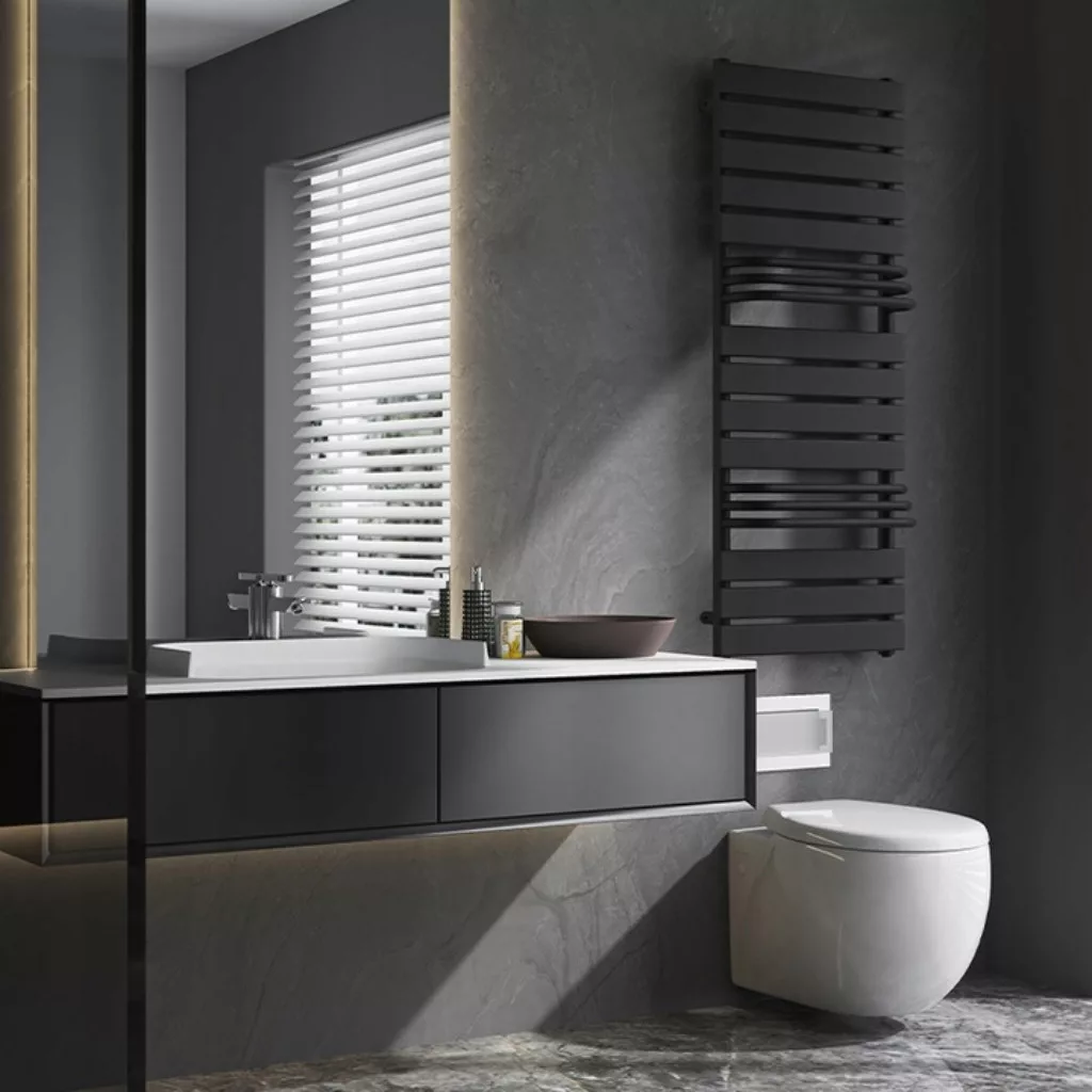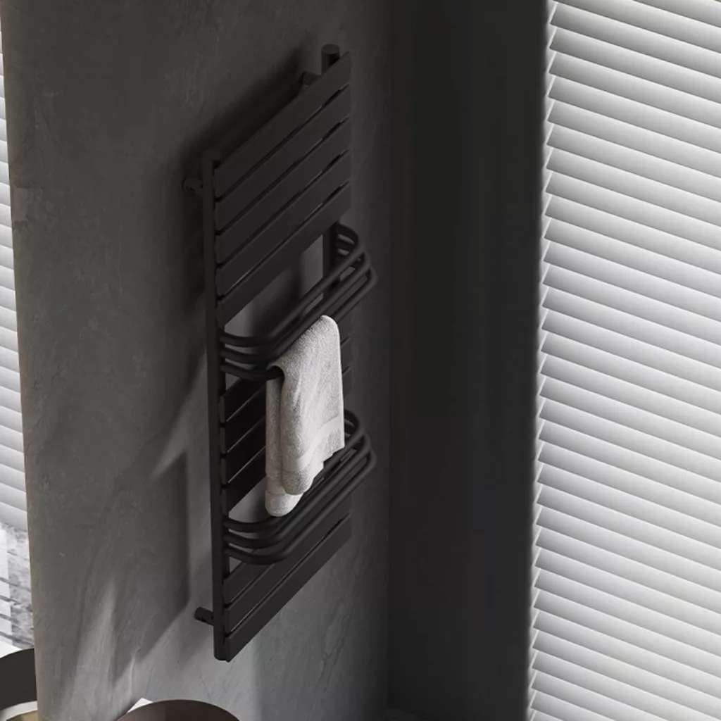 Mozgalmas formatervezés, a robosztus vízszintes panelek és a síkból kiemelkedő törölközőtartó csövek harmonikus kialakítása egyedi esztétikval bíró fűtőtestet eredményez.