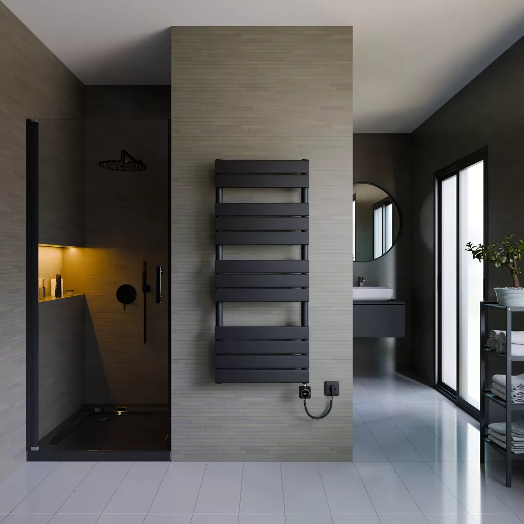 NERO Italia Largo design radiátor 50 x 120 cm-es méretben, fekete színben. Kiemelkedő minőségű design radiátor, a legjobb alapanyagok felhasználásával, precíziós hegesztéssel, magas gyártási minőségben előállított fűtőtest, nagy tartósságú porszórt festéssel. Szintén rendelhető elektromos fűtőpatronnal kiegészítve. Az elektromos fűtőbetét használata esetén a radiátor hálózati áramról működtethető, így a központi fűtésről keringetett víz bekötése nem szükséges. Esztétikus formatervezésének köszönhetően a fürdőszoba mellett egyéb helyiségekben is kiválóan alkalmazható.