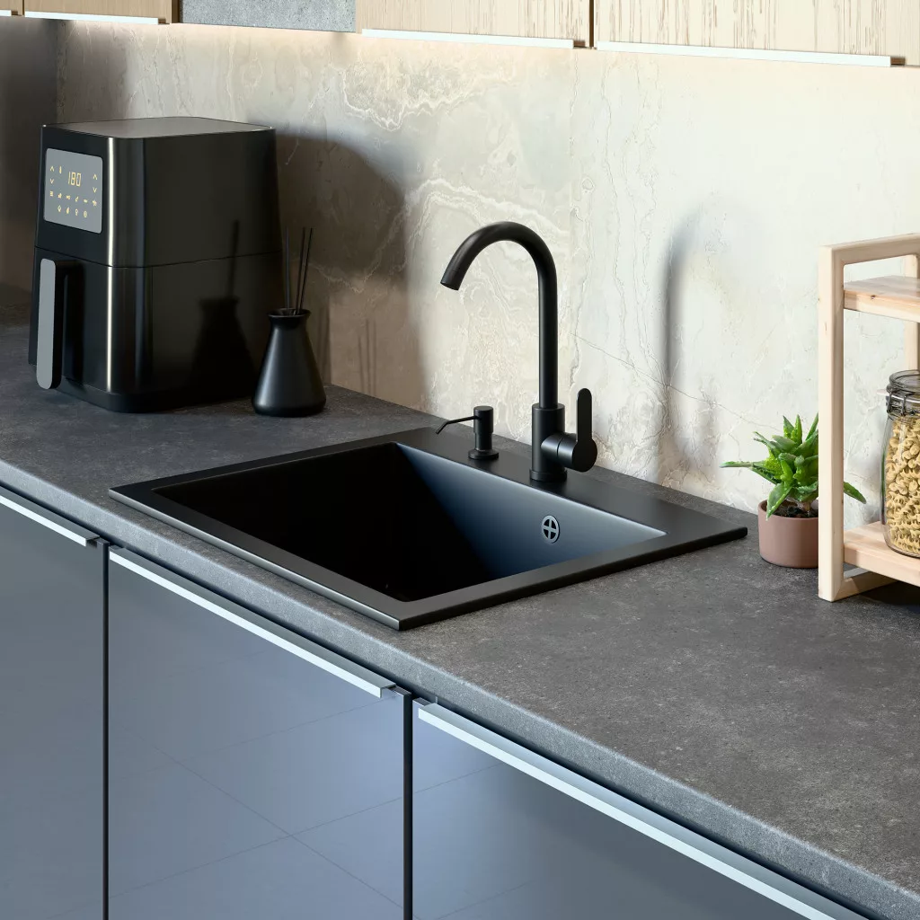 Gránit mosogató NERO Piazza-60 + magasított csaptelep + adagoló (fekete)