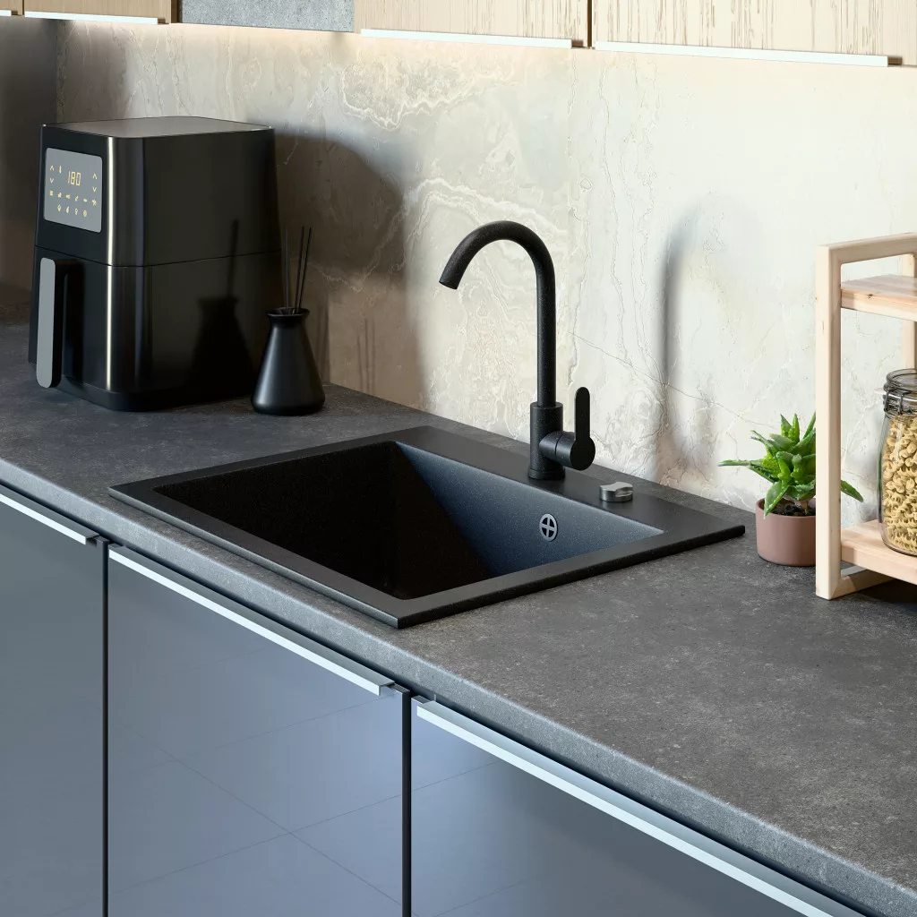 Gránit mosogató NERO Piazza-60 + magasított csaptelep + adagoló (fekete)