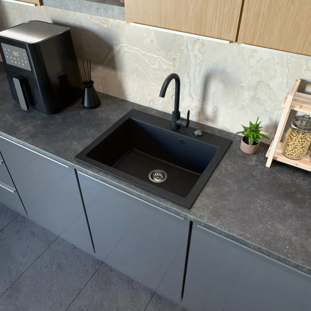 Gránit mosogató NERO Piazza-60 + Classico csaptelep + dugókiemelő (szemcsés fekete)