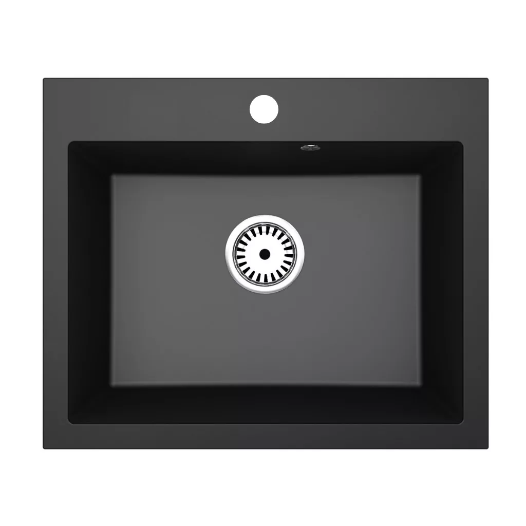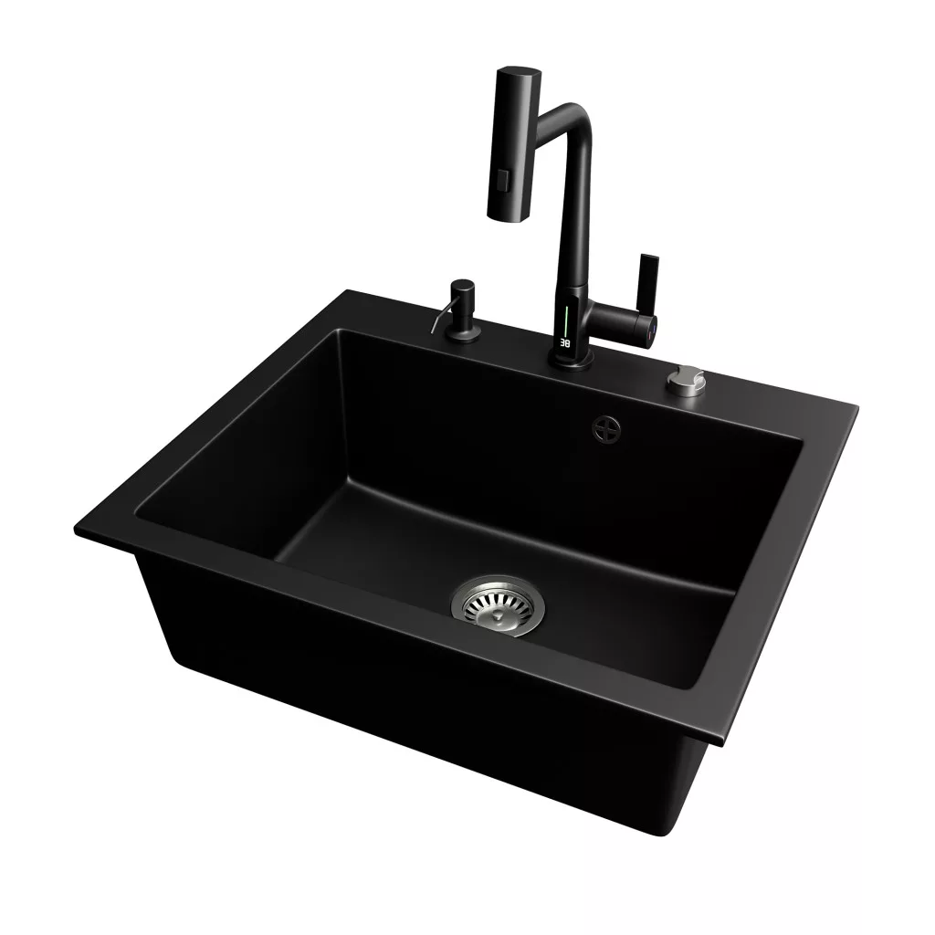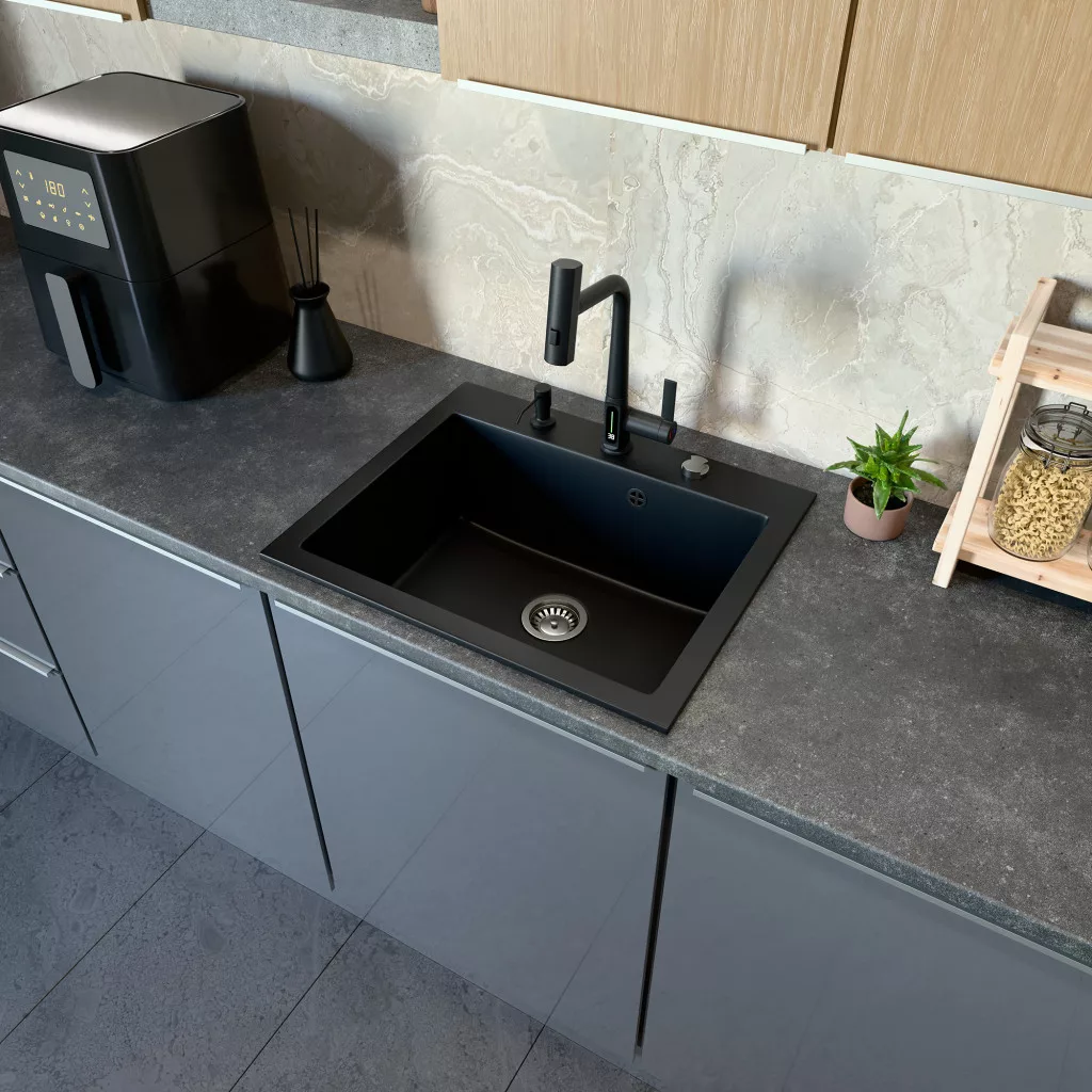 Gránit mosogató NERO Piazza-60 + magasított csaptelep + adagoló (fekete)