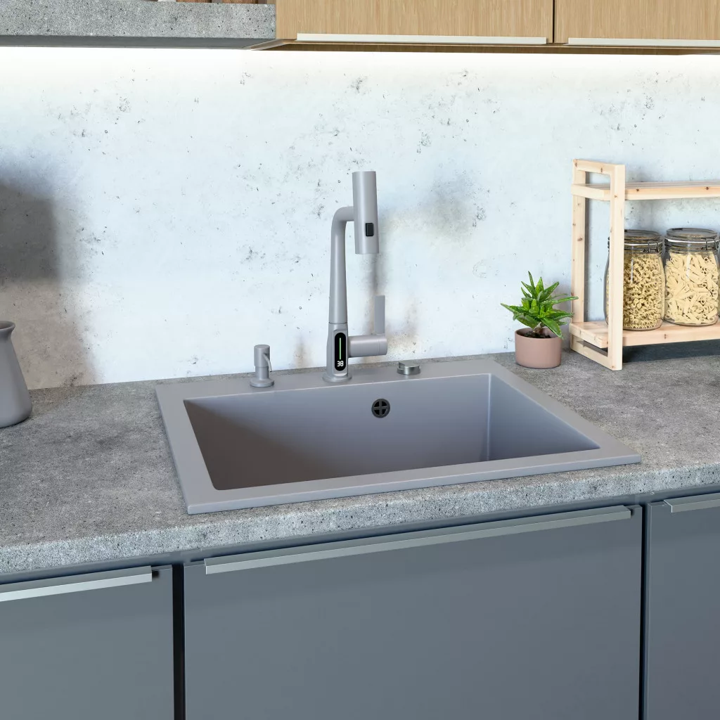 Gránit mosogató NERO Piazza-60 + Welland Enzo okoscsaptelep + adagoló + dugókiemelő (szürke)