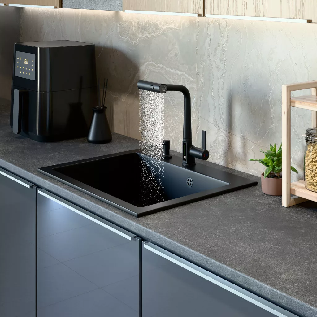 Gránit mosogató NERO Piazza-60 + magasított csaptelep + adagoló (fekete)