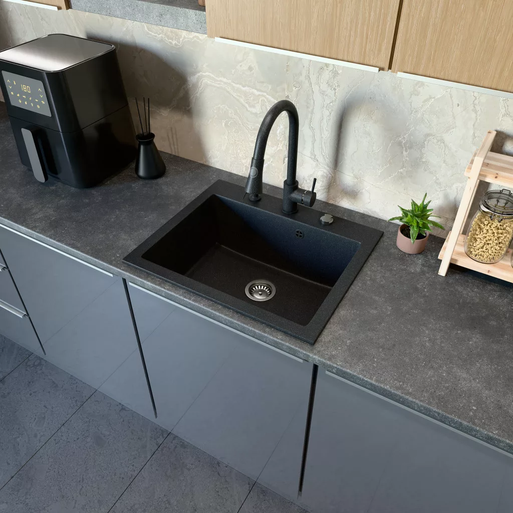Gránit mosogató NERO Piazza-60 + magasított csaptelep + adagoló (fekete)