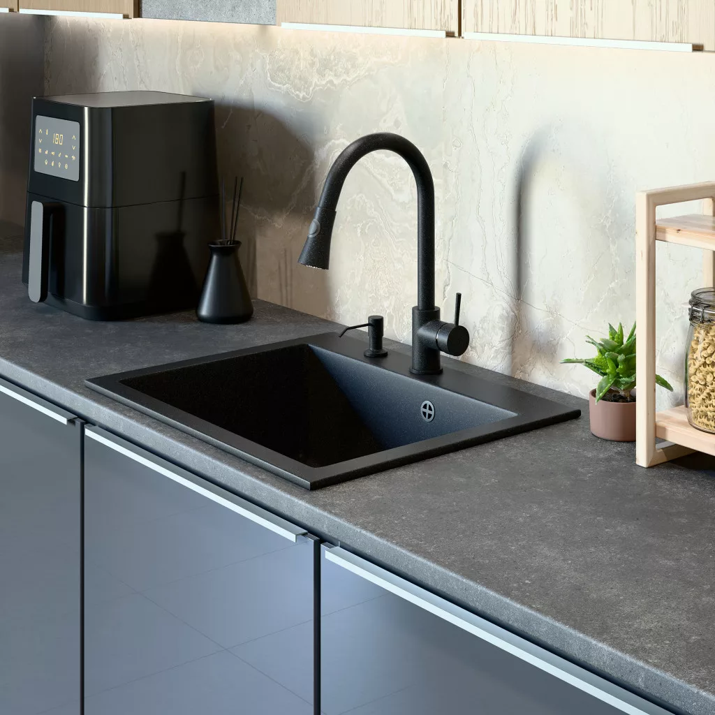 Gránit mosogató NERO Piazza-60 + magasított csaptelep + adagoló (fekete)