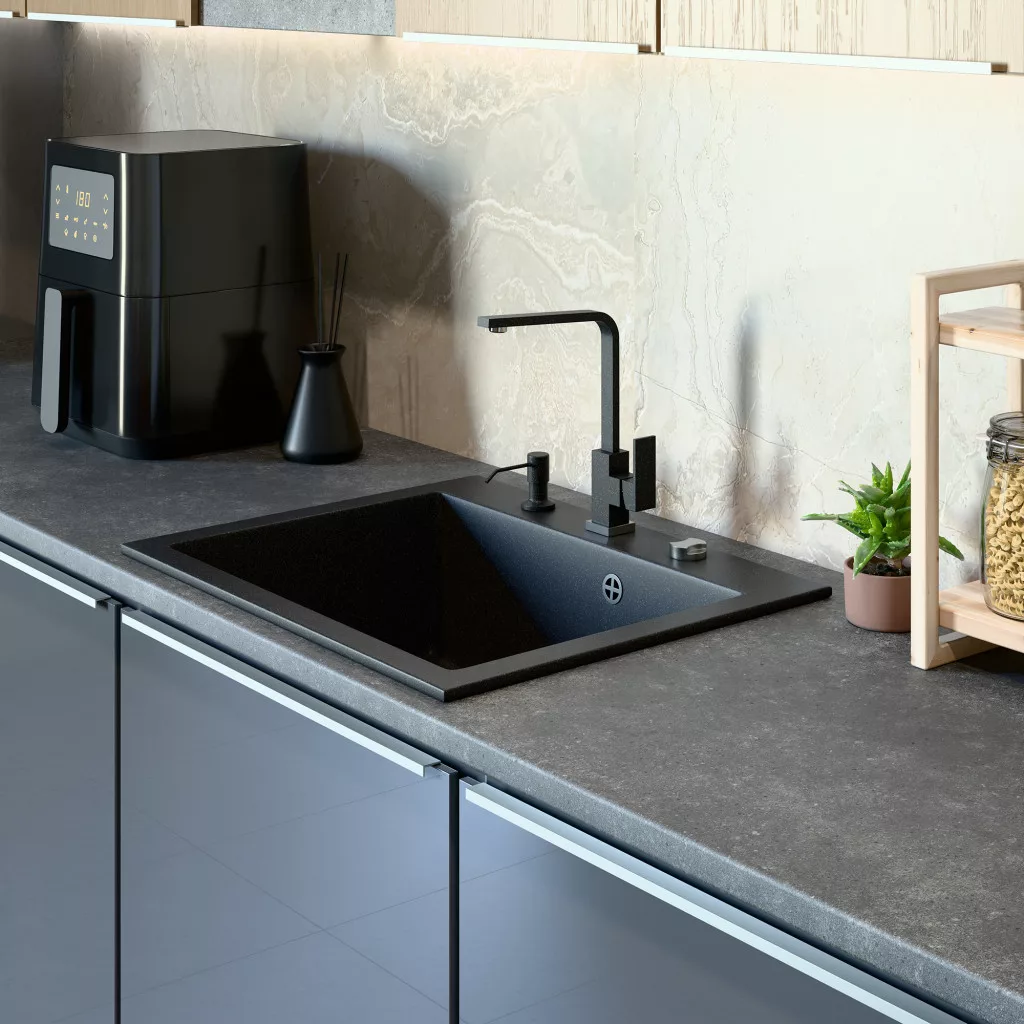 Gránit mosogató NERO Piazza-60 + magasított csaptelep + adagoló (fekete)