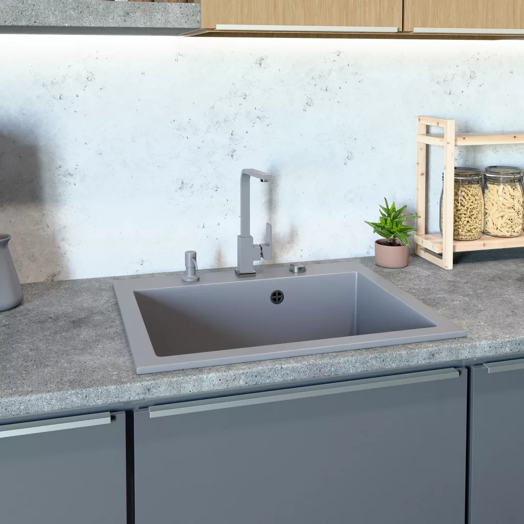Gránit mosogató NERO Piazza-60 + Vista csaptelep + adagoló + dugókiemelő (szürke)