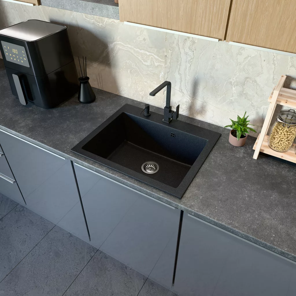 Gránit mosogató NERO Piazza-60 + magasított csaptelep + adagoló (fekete)