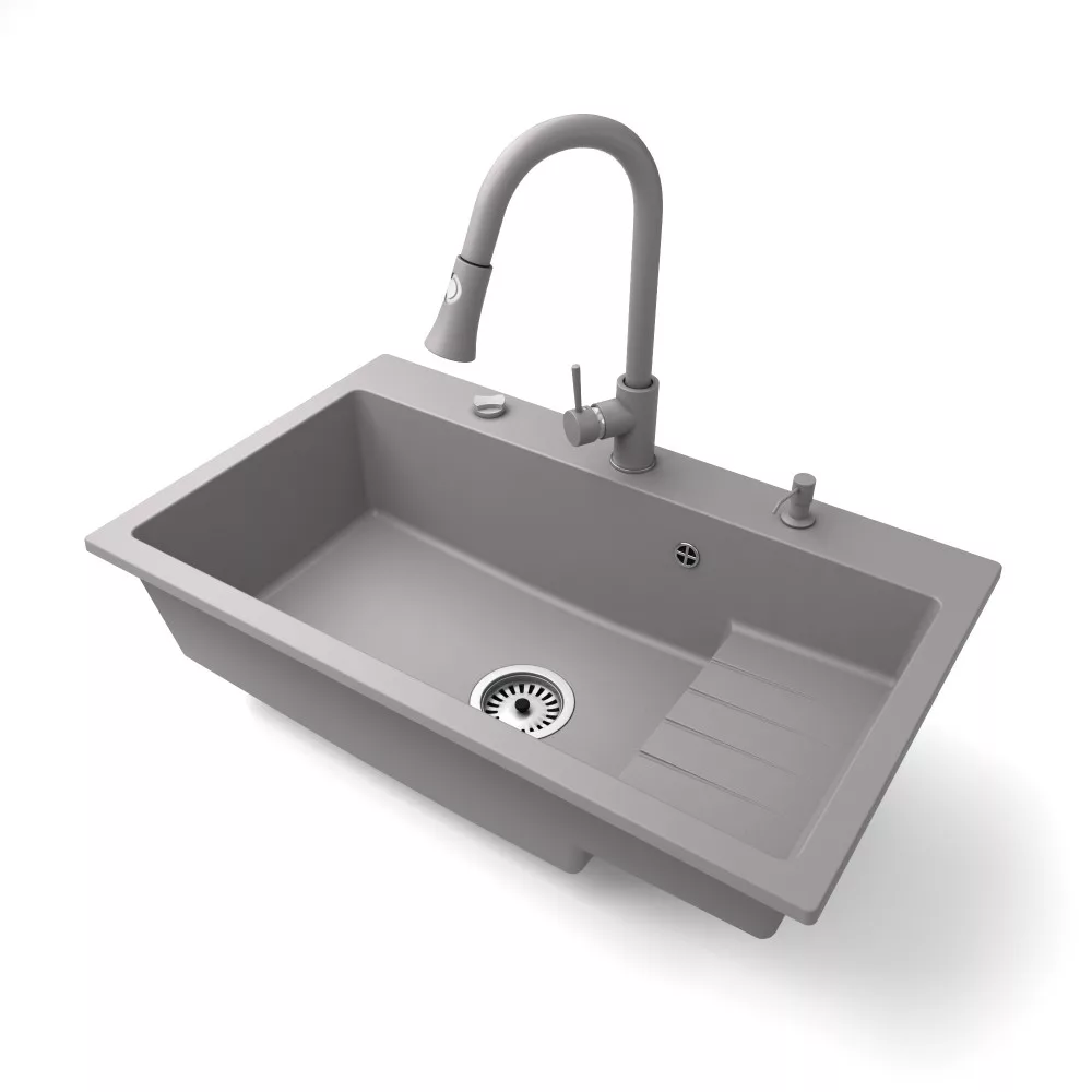 Gránit mosogatótálca NERO Boss + kihúzható Snake csaptelep + adagoló + dugókiemelő (szürke)