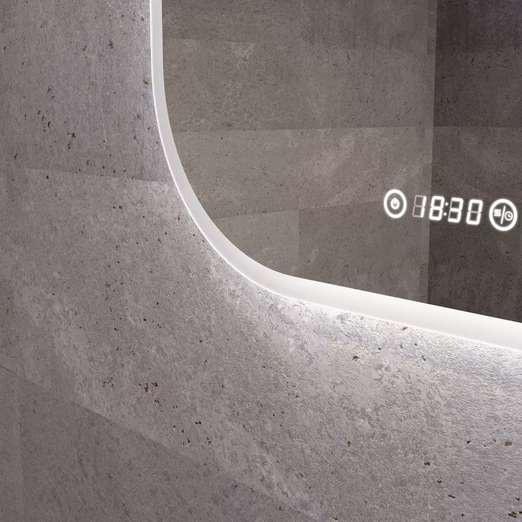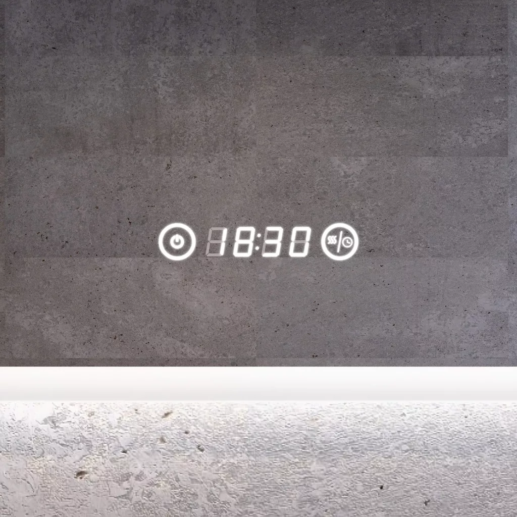 Digitális óra: A tükör felületén egy digitális óra található, ami praktikus a reggeli készülődés során. Az óra a tükörlapon külön keret nélkül jelenik meg, ami tovább fokozza az igényes esztétikai hatást.