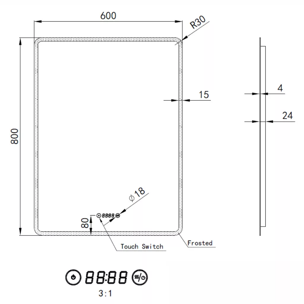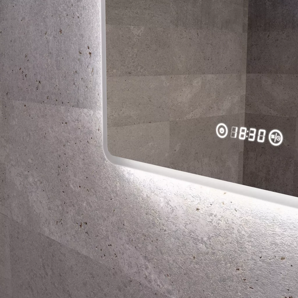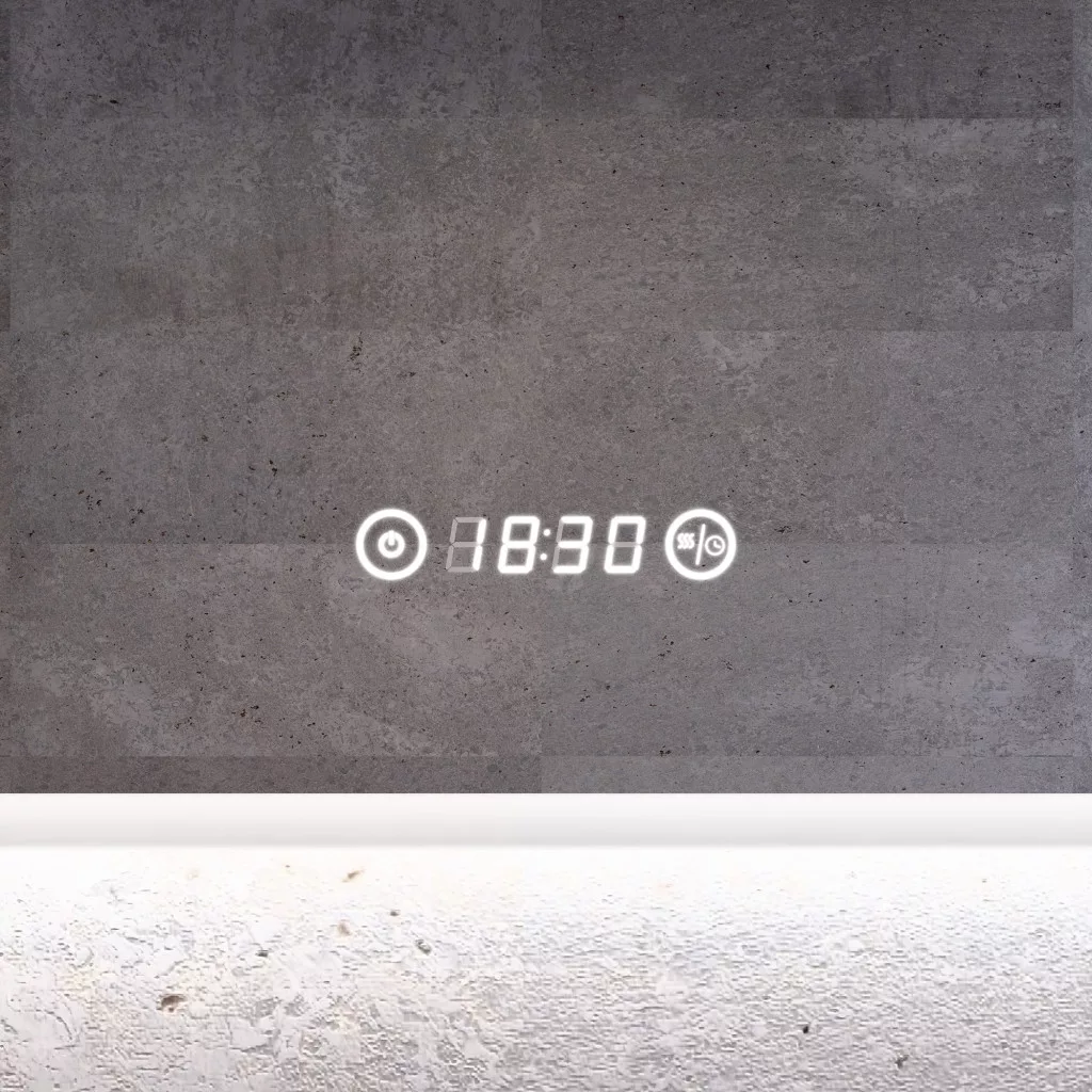 Digitális óra: A tükör felületén egy digitális óra található, ami praktikus a reggeli készülődés során. Az óra a tükörlapon külön keret nélkül jelenik meg, ami tovább fokozza az igényes esztétikai hatást.