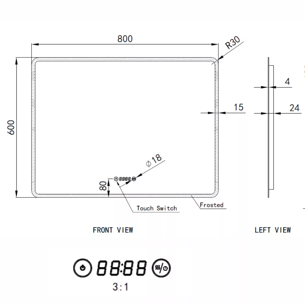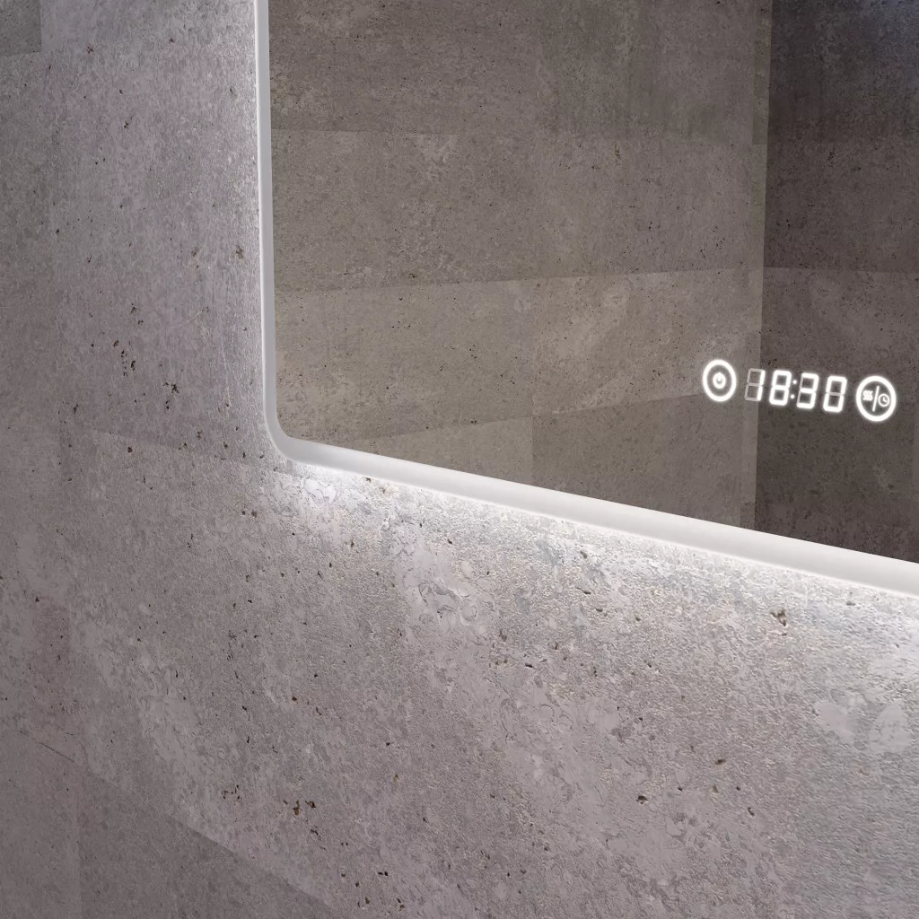 Digitális óra: A tükör felületén egy digitális óra található, ami praktikus a reggeli készülődés során. Az óra a tükörlapon külön keret nélkül jelenik meg, ami tovább fokozza az igényes esztétikai hatást.