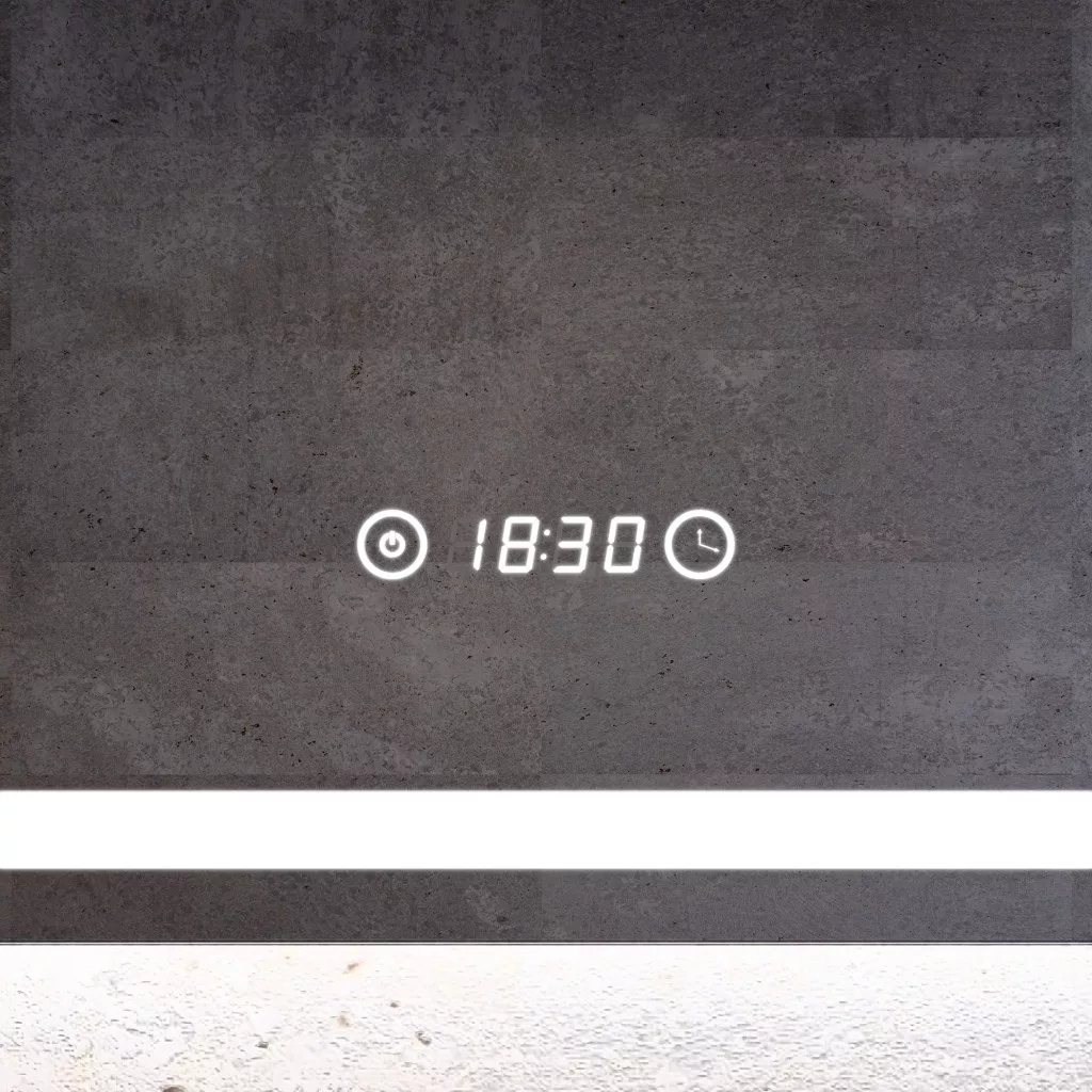 Digitális óra: A tükör felületén egy digitális óra található, ami praktikus a reggeli készülődés során. Az óra a tükörlapon külön keret nélkül jelenik meg, ami tovább fokozza az igényes esztétikai hatást.