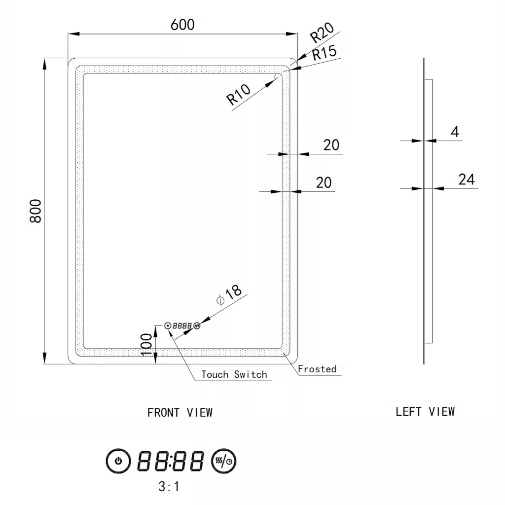 Welland Type-20V LED tükör - fényerő + színhőfok állítás + páramentesítő + óra - 60 x 80 cm
