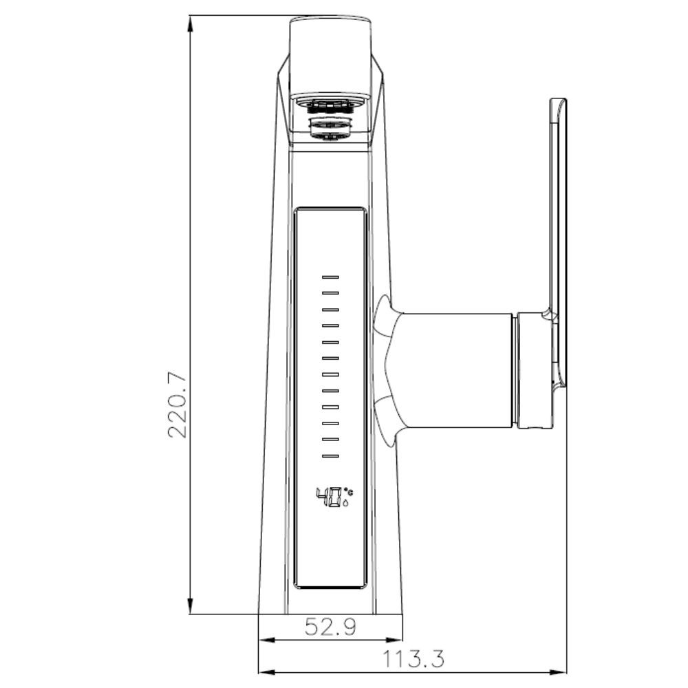 Digitális hőmérséklet kijelző: a pontos vízhőmérséklet a csaptelep alsó részén kialakított kijelzőn látható, ami mellett a víz hőmérsékletét és intenzitását egy függőleges diagram is mutatja.
