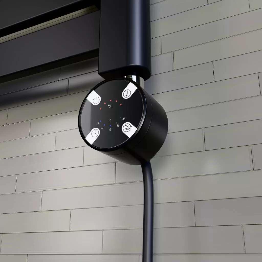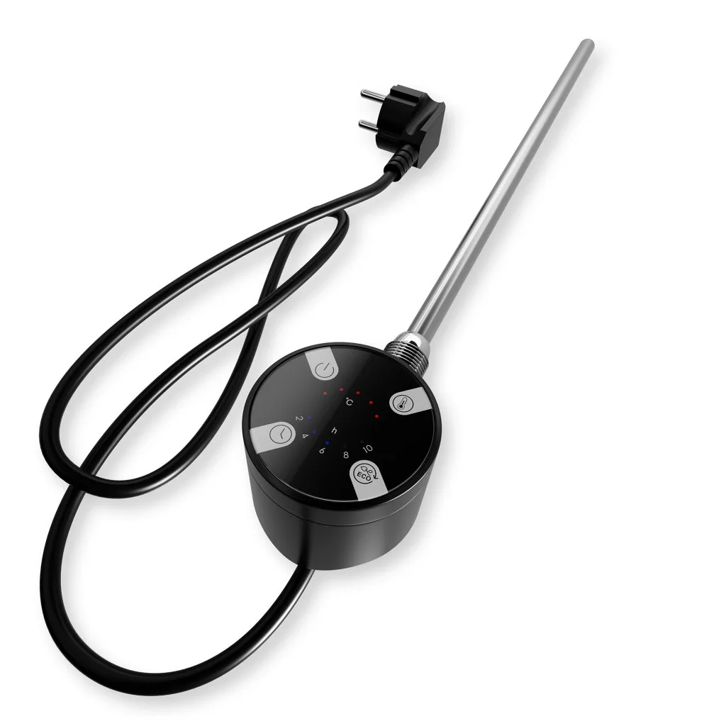 Nero Italia elektromos radiátor fűtőbetét / fűtőpatron törölközőszárító és design radiátorokhoz. Érintőgombos fűtőbetét, digitális kijelzővel, magas gyártási minőségben, megbízható vezérlővel, modern formatervezéssel.