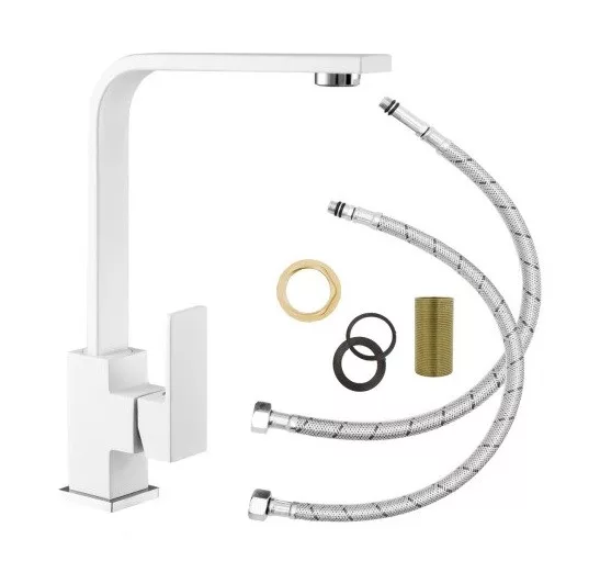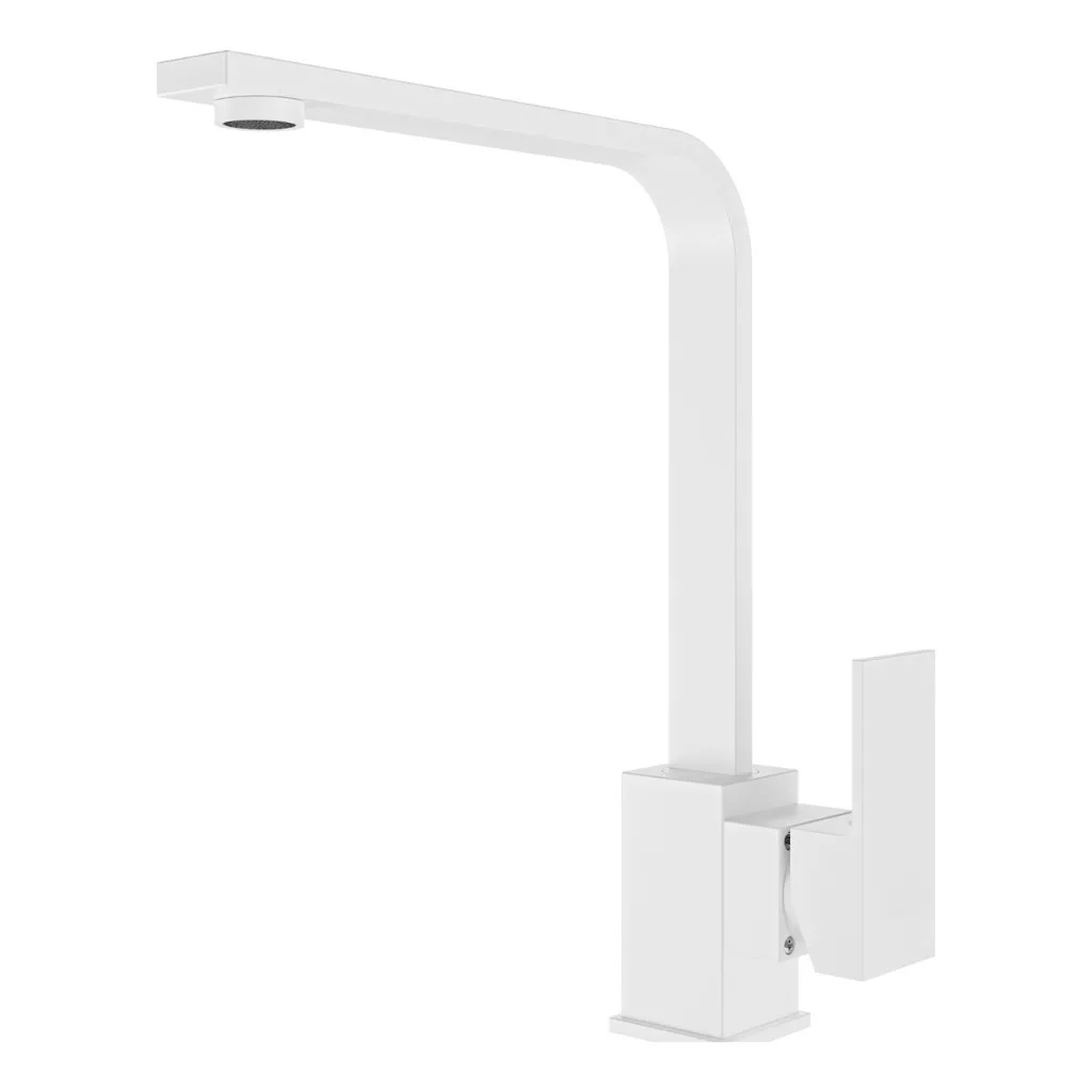 Letisztult, minimalista formatervezéssel kialakított mosogató csaptelep, ideális színazonos gránit mosogatótálcákhoz. Precíz kerámia keverőszeleppel szerelve, ami könnyű vízhőfok állítást tesz lehetővé. 360 fokban forgatható. A készlet tartalmazza a flexibilis bekötő csöveket és a mosogatótálcához történő rögzítéshez szükséges elemeket. Anyaga: SS304 rozsdamentes acél, nagy tartósságú matt fekete porfesetett felülettel. Bekötő átmérő: 3/8 coll. Fehér szín.