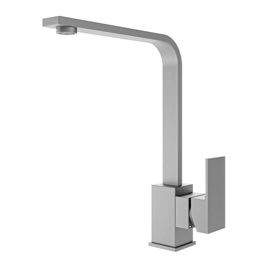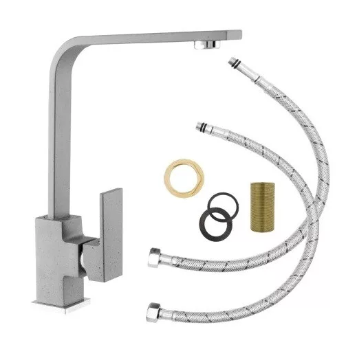 Letisztult, minimalista formatervezéssel kialakított mosogató csaptelep, ideális színazonos gránit mosogatótálcákhoz. Precíz kerámia keverőszeleppel szerelve, ami könnyű vízhőfok állítást tesz lehetővé. 360 fokban forgatható. A készlet tartalmazza a flexibilis bekötő csöveket és a mosogatótálcához történő rögzítéshez szükséges elemeket. Anyaga: SS304 rozsdamentes acél, nagy tartósságú matt fekete porfesetett felülettel. Bekötő átmérő: 3/8 coll. Szürke szín.