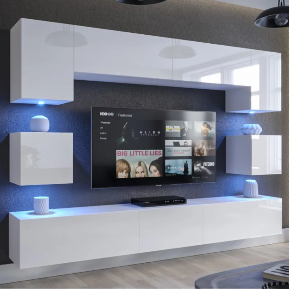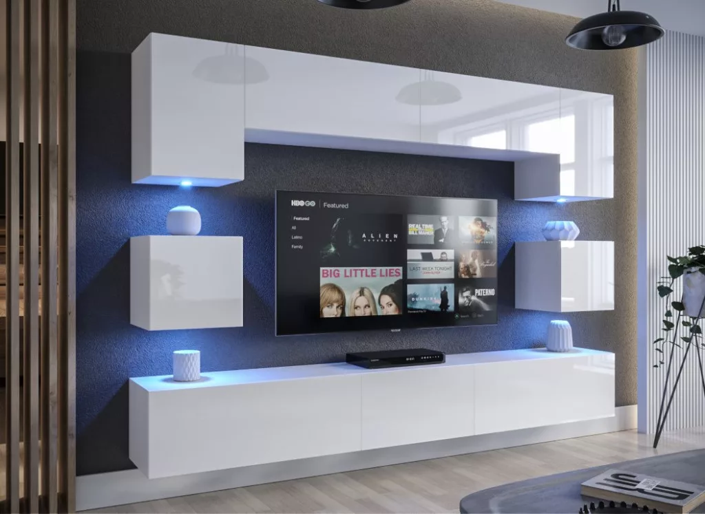 Intenso Concept-21, 9 elemes falra szerelhető nappali szekrénysor. Prémium minőségű bútorlapok, minden oldalon egységesen magasfényű fehér felülettel. A készlet számos tároló egységet tartalmaz, tökéletesen illeszkedik bármely nappali belső terébe. 15 mm vastagságú, kétoldalas laminált lapból készült, amelyre jellemző a mechanikai sérülésekkel szembeni nagy ellenállás. A bútorok szélei ABS élfóliával vannak furnérozva, amely az egyik legjobb minőségű hőre lágyuló szegély - ezek a legkevésbé sebezhetőek a mechanikai sérülésekkel szemben. Push to open rendszer, amely lehetővé teszi az egyes szekrények előlapi kattintással történő kinyitását. A termék rendelhető bútor és üvegpolc megvilágító LED modulokkal kék vagy fehér színben.