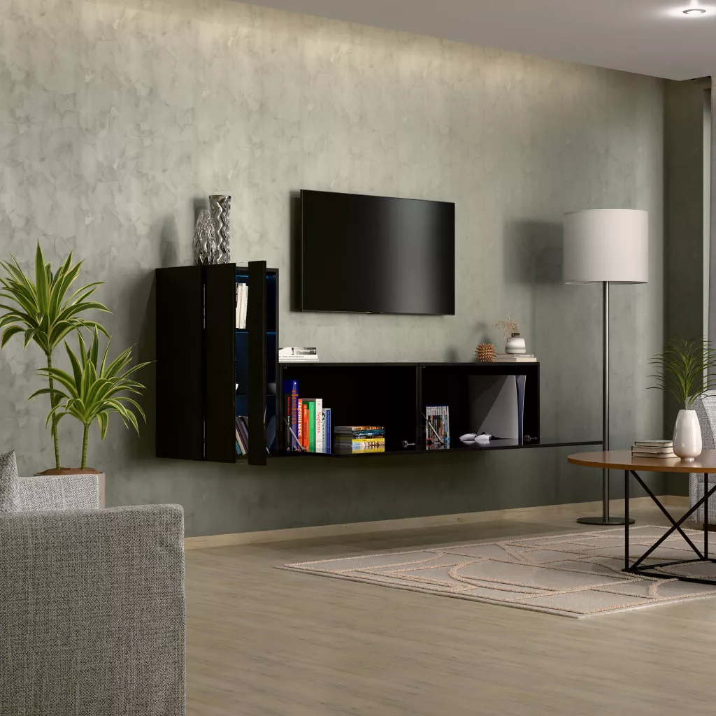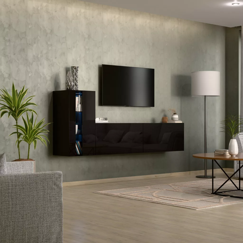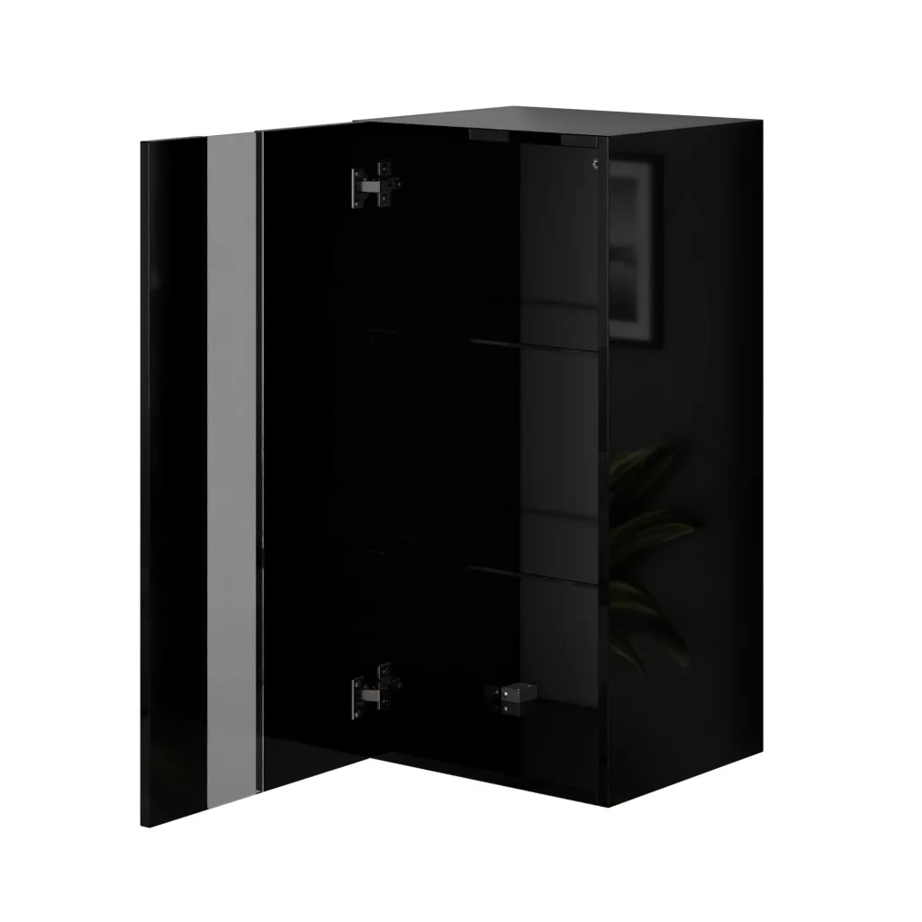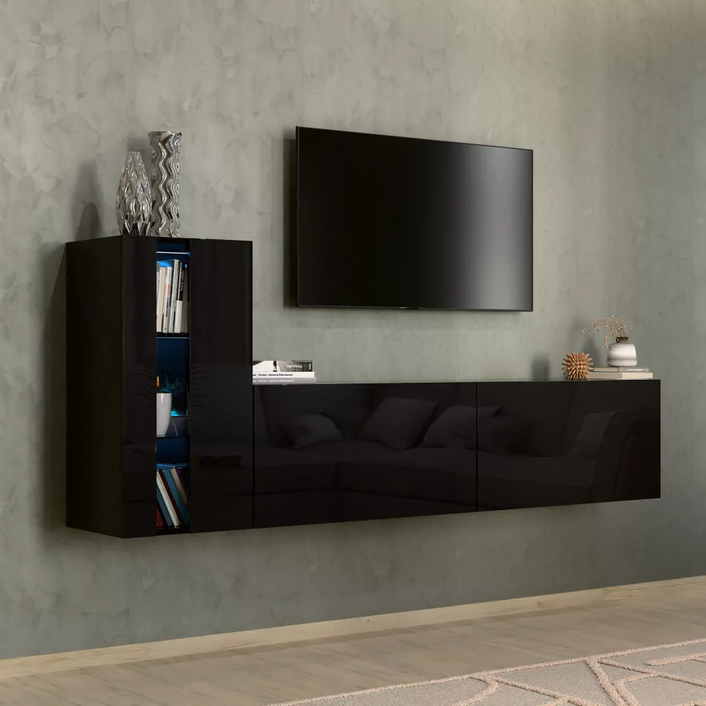 Intenso Concept-11, 3 elemes falra szerelhető nappali szekrénysor. Prémium minőségű bútorlapok, minden oldalon egységesen magasfényű fekete felülettel. A készlet számos tároló egységet tartalmaz, tökéletesen illeszkedik bármely nappali belső terébe. 15 mm vastagságú, kétoldalas laminált lapból készült, amelyre jellemző a mechanikai sérülésekkel szembeni nagy ellenállás. A bútorok szélei ABS élfóliával vannak furnérozva, amely az egyik legjobb minőségű hőre lágyuló szegély - ezek a legkevésbé sebezhetőek a mechanikai sérülésekkel szemben. Push to open rendszer, amely lehetővé teszi az egyes szekrények előlapi kattintással történő kinyitását. A termék rendelhető bútor és üvegpolc megvilágító LED modulokkal kék vagy fehér színben.