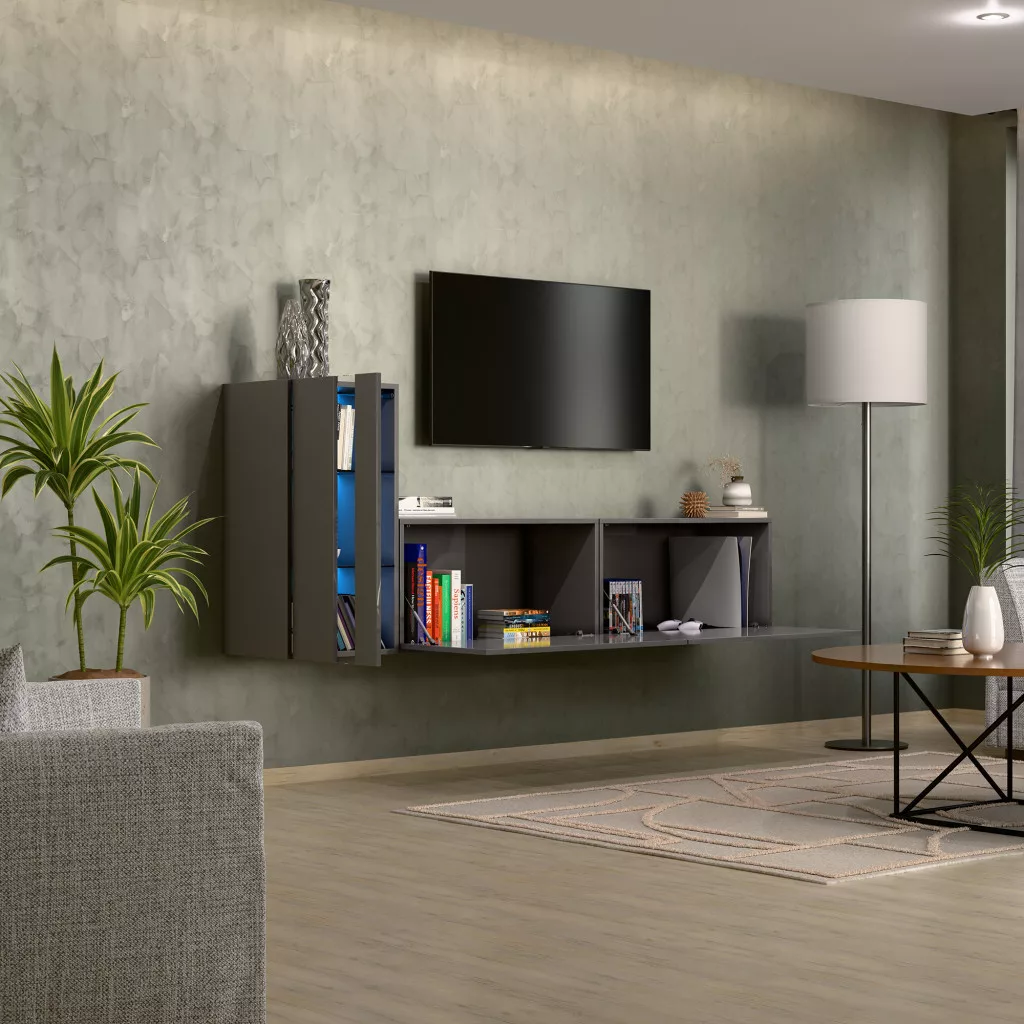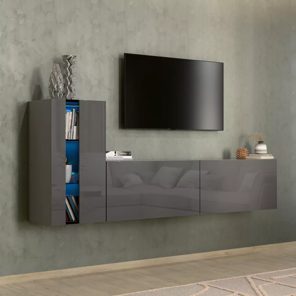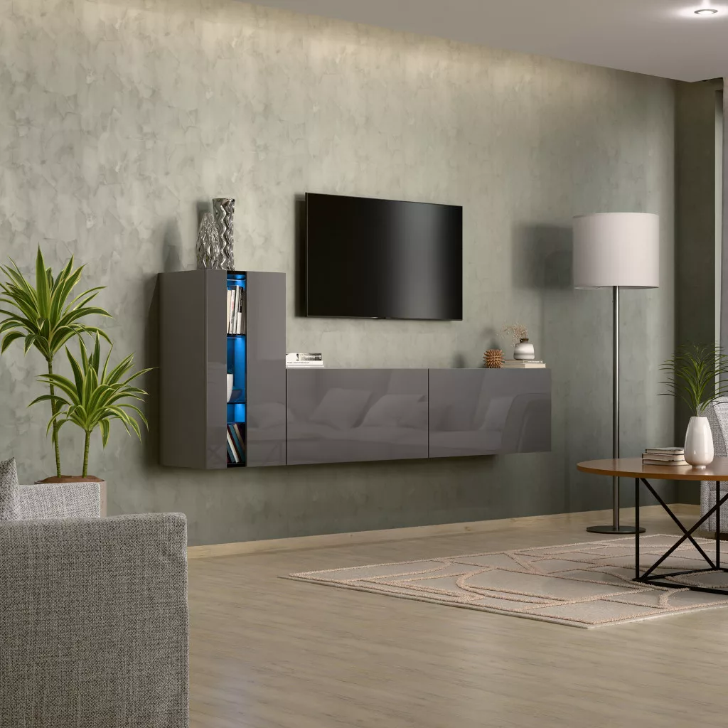 Intenso Concept-11, 3 elemes falra szerelhető nappali szekrénysor. Prémium minőségű bútorlapok, minden oldalon egységesen magasfényű szürke felülettel. A készlet számos tároló egységet tartalmaz, tökéletesen illeszkedik bármely nappali belső terébe. 15 mm vastagságú, kétoldalas laminált lapból készült, amelyre jellemző a mechanikai sérülésekkel szembeni nagy ellenállás. A bútorok szélei ABS élfóliával vannak furnérozva, amely az egyik legjobb minőségű hőre lágyuló szegély - ezek a legkevésbé sebezhetőek a mechanikai sérülésekkel szemben. Push to open rendszer, amely lehetővé teszi az egyes szekrények előlapi kattintással történő kinyitását. A termék rendelhető bútor és üvegpolc megvilágító LED modulokkal kék vagy fehér színben.