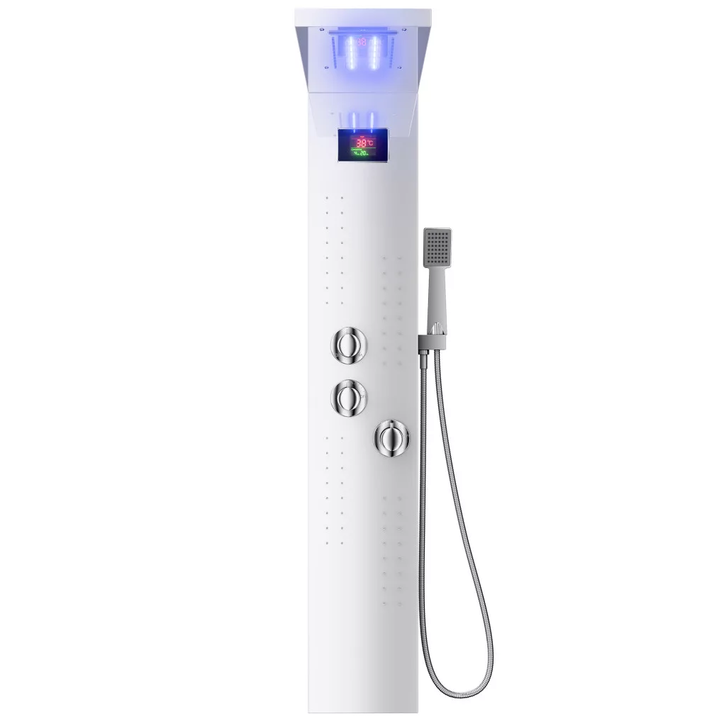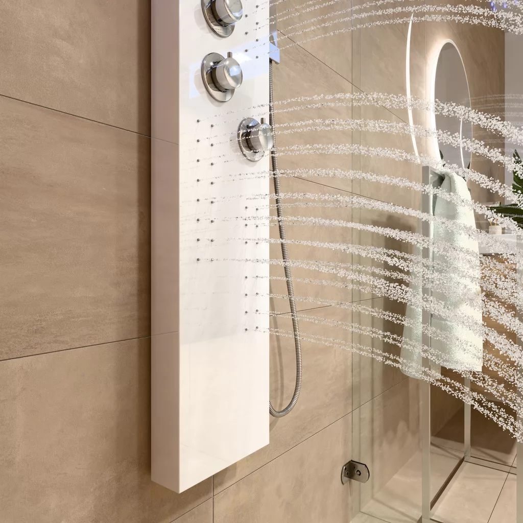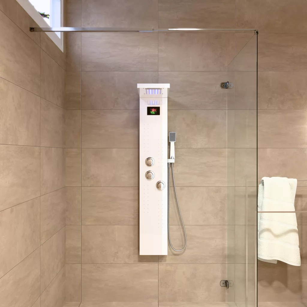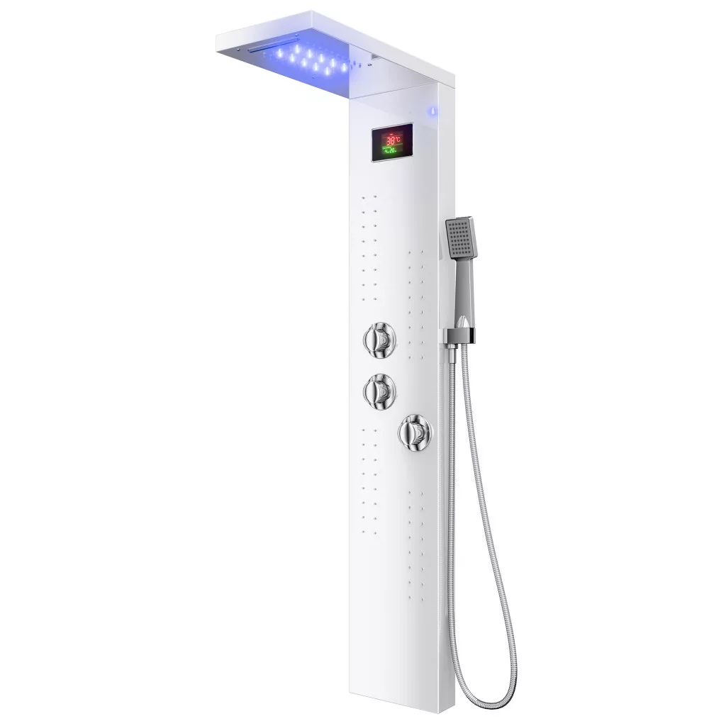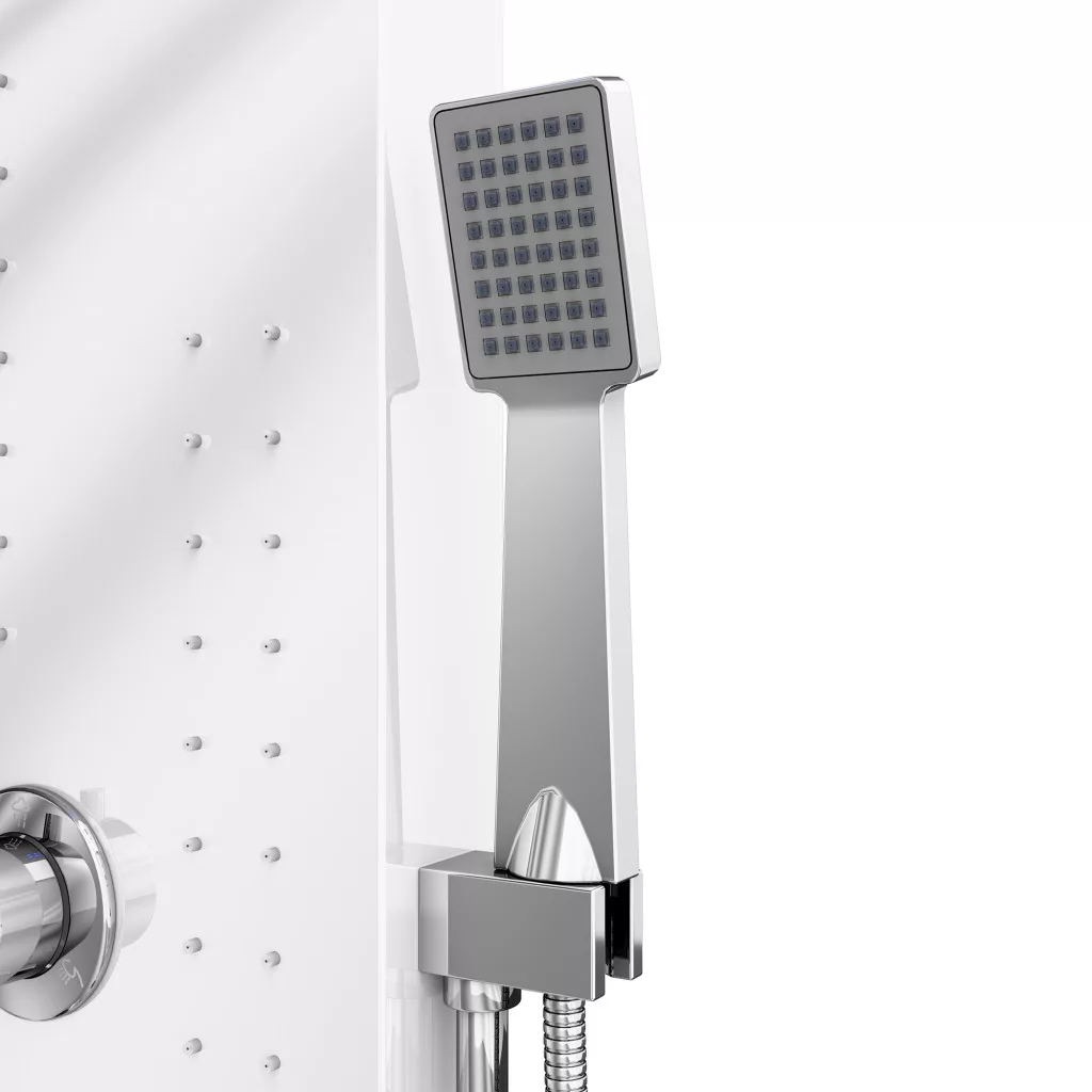 Welland EC-1034 multifunkciós zuhanypanel. A váltókapcsoló segítségével a víz folyása a zuhanyrózsából, a külön szabályozható masszázsfúvókákból, vagy az esőztető fejzuhanyból történhet. Az esőztető fejzuhany AntiCalc rendszerű fúvókákkal gyártott modell, a víz áramlása során lerakódó vízkő a szilikon alapú zuhanyfúvókákból egy könnyű mozdulattal kinyomható. Digitális vizhőfok kijelzővel ellátott zuhanypanel. Minőségi anyagokból, minimalista formatervezéssel kialakított zuhanypanel, nagy tartósságú fehér festéssel kiakalított modern design.