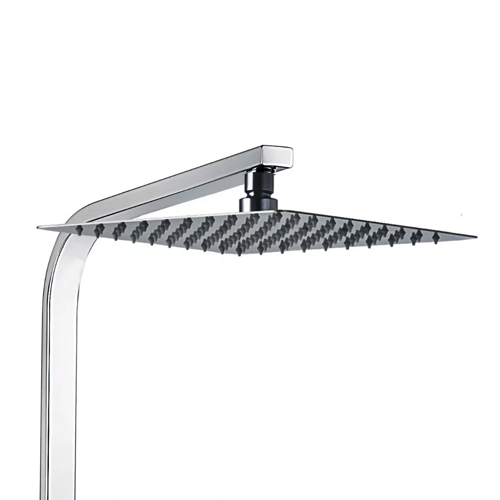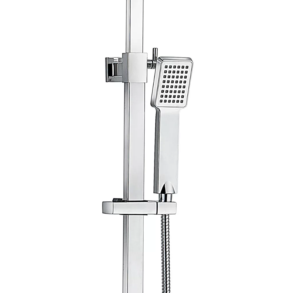 Welland Montana zuhanyrendszer falon kívüli felszállócsővel, sárgarézből készült precíz keverőszeleppel ellátott csapteleppel. A váltókapcsoló segítségével a víz folyása a zuhanyrózsából vagy a 23 cm-es fejzuhanyból történhet. készlet tartalmaz egy 23 cm-es fejzuhanyt és egy zuhanyrózsát, mindkettő modern Anti-Calc rendszerrel. Szögletes, minimalista formatervezés, hosszú élettartamot biztosító króm felülettel.